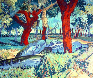 A picture (100 x 120 cm) that delayed two years to be concluded, it was necessary many pauses and reflections and still a trip to the Museum Sorolla in Madrid and diverse trips to the place (Farm of the Barrigoso, according to the military map, Farm of Varregoso, according to the local toponymy) where we can find this Quercus suber, with drawings in the sketch book that helped me to find the agreement of the colors, basically the interactions between the light and the shade and the question of the contour… the way it differs when the light can be explored or when the shade goes shaping the surfaces. From Sorolla I collected the notion of the modelation alla prima, nothing that I not used previously, but it is always good seeing from a master. I like to work in the “edge of the knife” between this antinomy: Alla prima and underpainting. Underpainting was taught to me 20 years ago from my first painting professor Ross Curtis, who passed away 2 years ago. This method consists of overlapping in layers chromatic spots. Because Ross was American and taught in English this concept to me, I keep the anglicism to homage this professor and master. Alla prima is the technician name who comes in History of Art books and means the at once painting, with mixtures of tones in an expressive form at once, much used by the French impressionists painters in the exterior (en plein air), or even by Sargent's portraits in interior environment pictures.