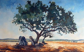These two pictures of 2006/2008 have the same format of 50 x 80 cm. The long work of these paintings is due to a gradual fight of the forms, a fight of construction and unconstruction. The composition and the resultant atmosphere in each one of these pictures are oposed. One is the vertical placidness and the ample space, whereas the other is a fight for the survival between red trunks and blue branches, where the vertical lines are opposed to the horizontal lines.